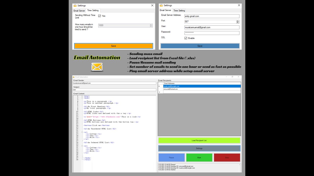 - Load recipient list from Excel file (*.xlsx)
